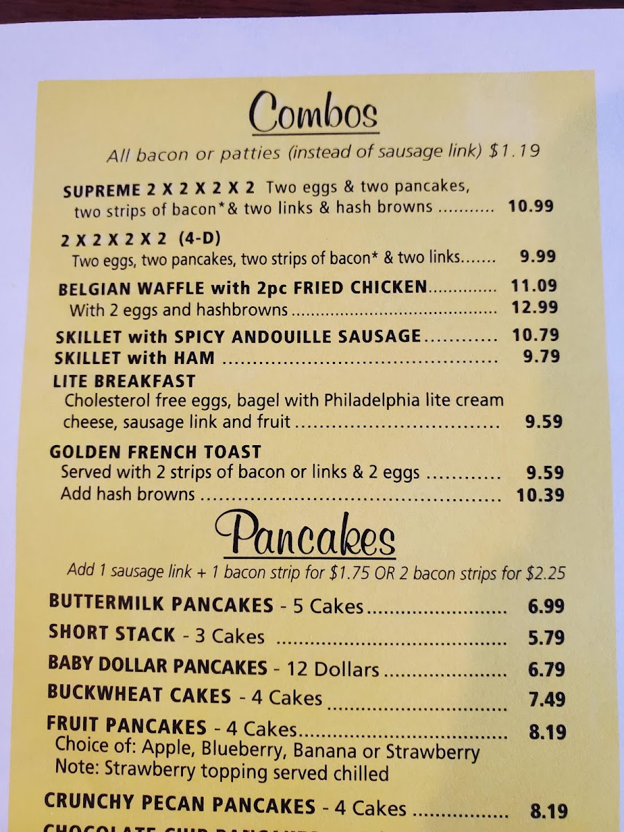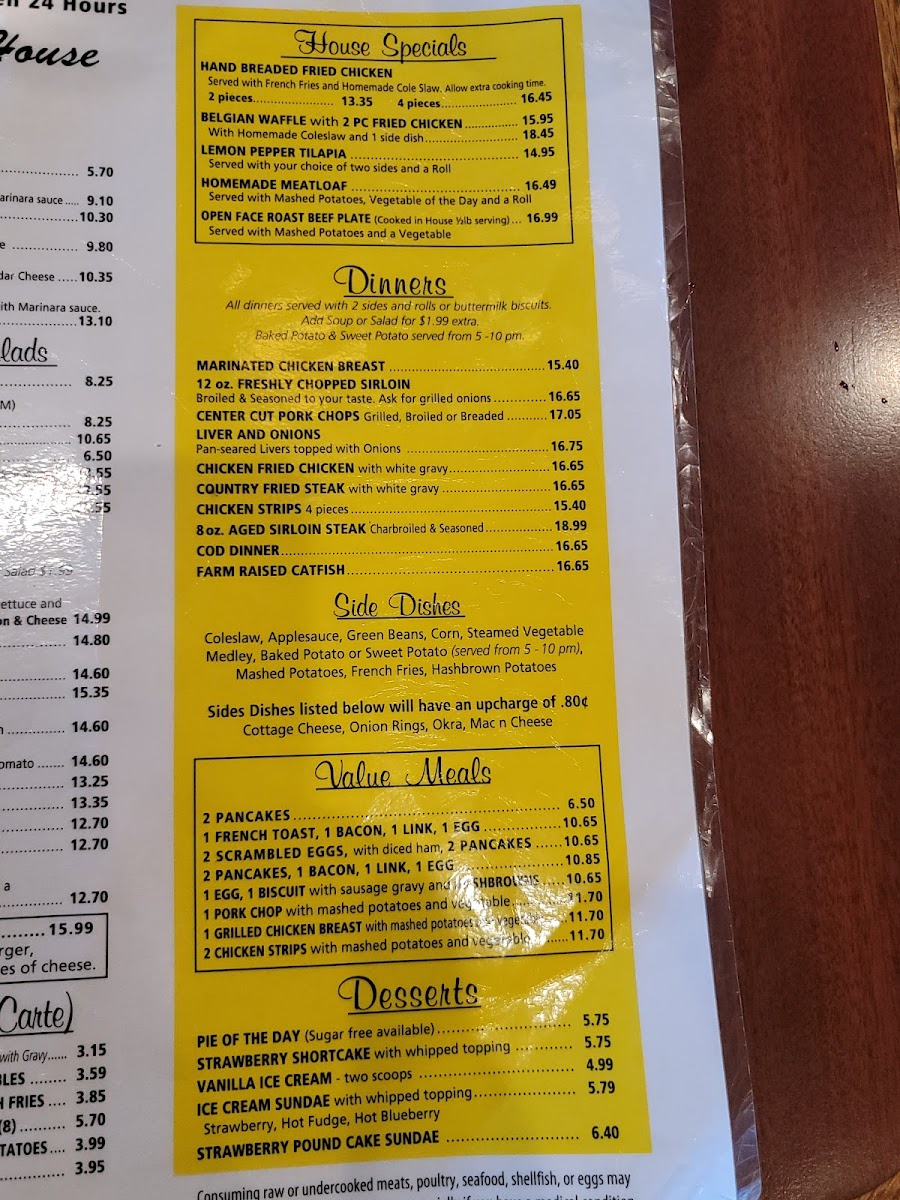 The menu features classic breakfast staples like fluffy buttermilk pancakes, including variations such as chocolate chip, pumpkin, and pecan, alongside hearty sides like bacon, sausage, and eggs cooked to order. For those seeking a midday or evening meal, house specials like hand-breaded fried chicken, homemade meatloaf, and open-faced roast beef provide warm, satisfying options that echo the welcoming atmosphere of the space.